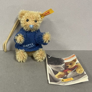 Merci Teddy bear, is 8 cm in size (3.25 inch), 5-way jointed, made from blond colored mohair, is not limited, was originally not issued with a collectors box/certifcate of authenticity and was issued in 2004.