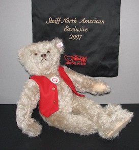 Rudi Teddy bear, is 50 cm in size (19.75 inch), 5-way jointed, made from gray colored mohair, is limited to 1500 pieces, comes in a bag, has a certifcate of authenticity and was issued in 2007. Rudi represented the first completely poseable Steiff Teddy bear ever! Originally designed as part of a window display for a German department store in the 1920’s, only one prototype of Rudi was ever produced. He was fitted with wired arms and legs, allowing him to assume all sorts of comical poses!